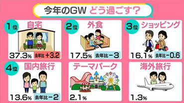 「1日でも休める皆さんがGWに何をして過ごすのか。最も多かったのは『自宅で過ごす』で37.3%。続いて『外食』が17.5%、『ショッピング』が16.1%、『国内旅行』が13.6%。『テーマパーク』は2.1%で、1.3%の人たちは『海外旅行』でした」
