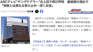 ABCテレビ“ヤングケアラー”炎上回で再び声明 番組側の演出で「実態とは異なる受け止め…深く反省」
