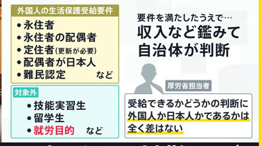 生活保護法は、適用対象を日本国民と定めている。外国人は人道上の観点から、永住者や定住者など一定の在留資格がある人や、難民認定された場合は、自治体による「行政措置」として対象としている。