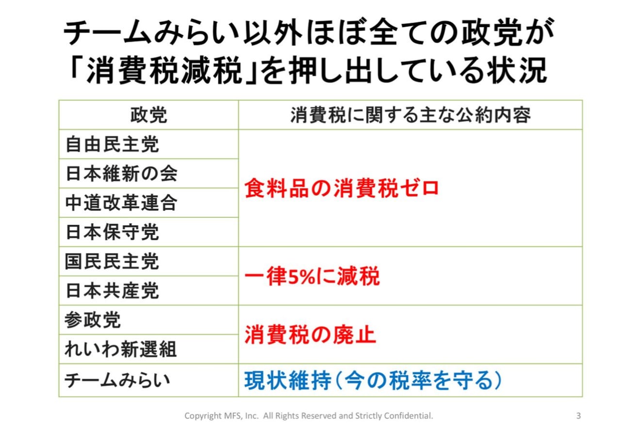 現在、チームみらいを除くほぼ全ての政党が消費税減税を打ち出している状況です。