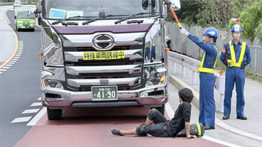 辺野古沖の現場海域に近い米軍「キャンプ・シュワブ」のゲート前では、土砂を積んだダンプカーの搬入を阻止しようと、座り込みによる抗議活動が行われた。ダンプカーの前に横たわる人の姿もみられたが、いずれもまもなく、機動隊員らに移動させられた。